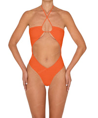 - Style: Halter Tie Neck One Piece With Center Front Cutout