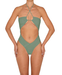 - Detail Feature: Halter tie neck one piece with center front cutout and V shape bottom, high cut leg opening, spaghetti straps. Multi-style as halter or bandeau