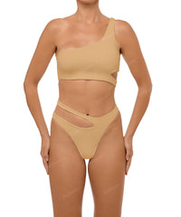 - Detail Feature: Asymmetric bikini top, Fixed shoulder strap, Side cut out detail, Pull on style