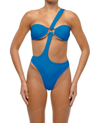- Detail Feature: One-shoulder one-piece with wave ring detail, front and back cut-outs, clasp closure, and a high-cut leg