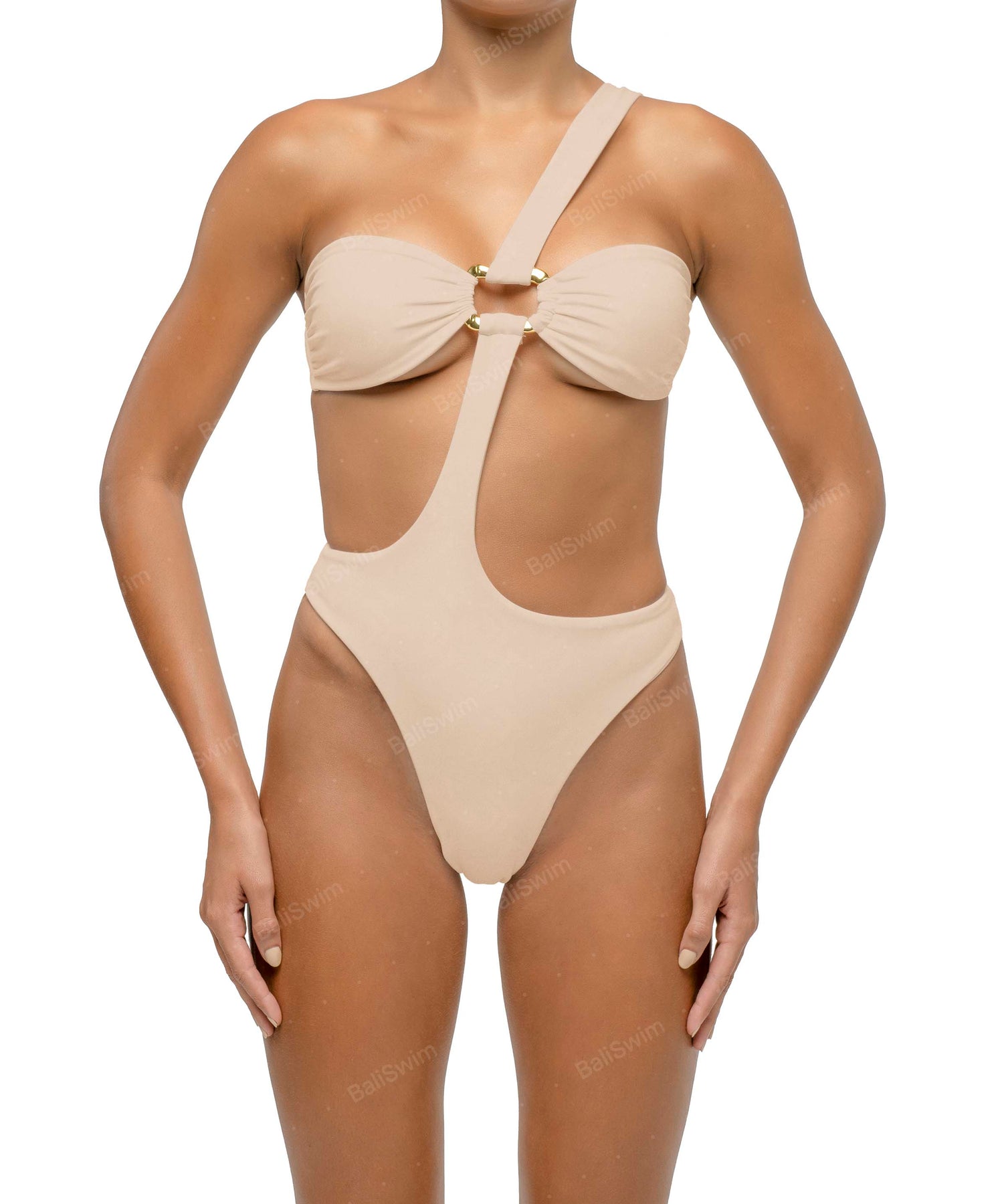 - Detail Feature: One-shoulder one-piece with wave ring detail, front and back cut-outs, clasp closure, and a high-cut leg