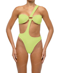 - Detail Feature: One shoulder detail, Wave ring detail, Front and back cut-out, High cut, Clasp closure