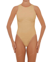 - Detail Feature: Sleeveless rash guard one-piece with a high round neck, curved and gathered bust detail, and a back zipper opening