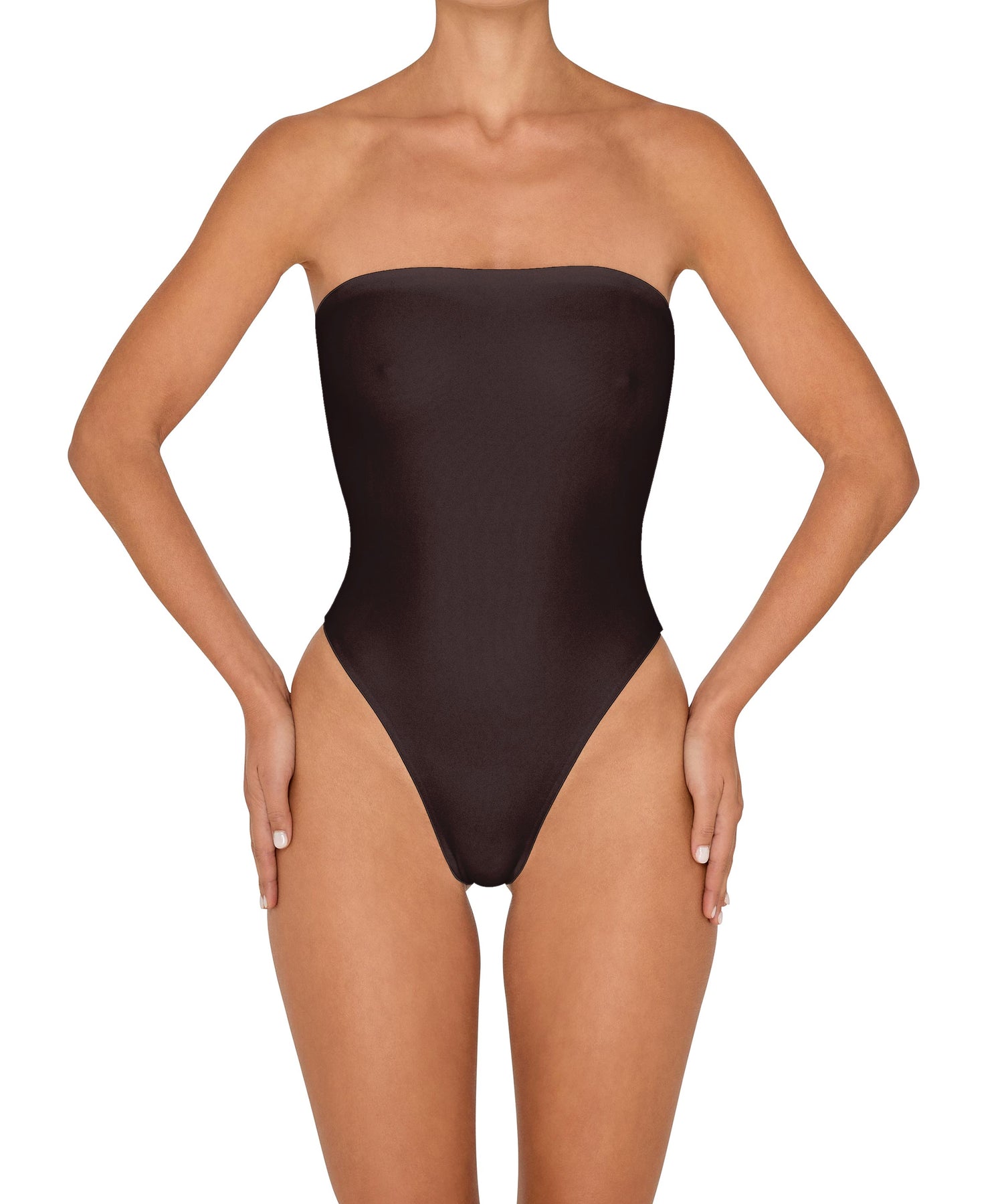 - Detail Feature: Classic strapless onepiece, high hip cut, silicon tape on the top bust to prevent slippage, and seamless finish