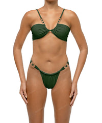 - Detail Feature: Double rings bottom, Ruched detail, Adjustable front and bum coverage, Mid rise, High cut