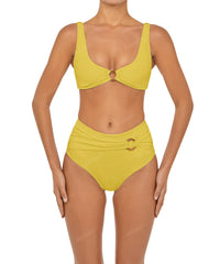 - Detail Feature: High rise bikini bottom, Waist overlay with O-Ring, Ruched detail