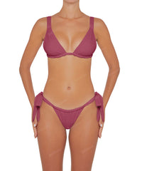 - Detail Feature: Low-rise, high-cut Brazilian bikini bottom with wide side ties and adjustable front and bum coverage