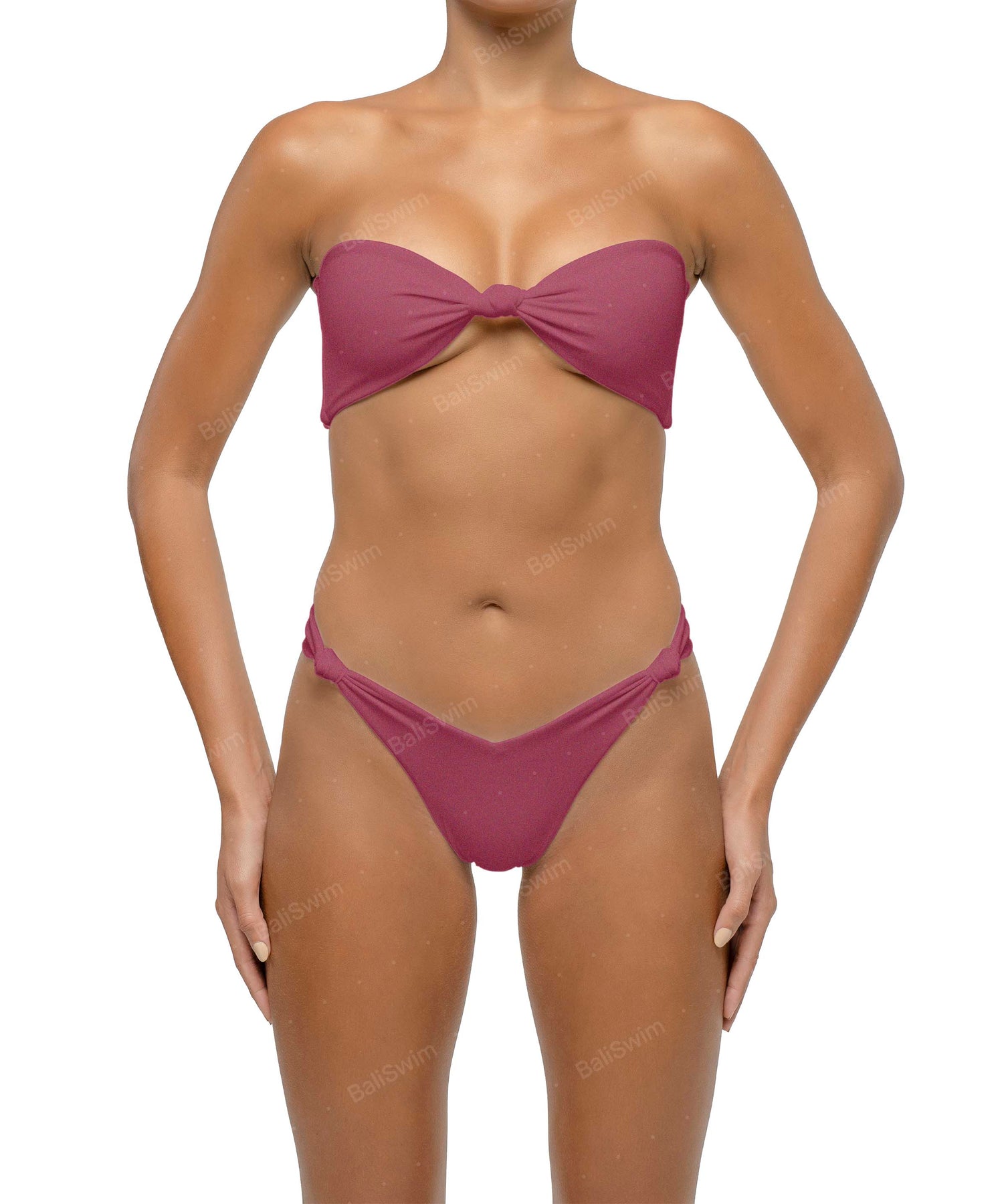 - Detail Feature: Bandeau bikini top, Sweetheart neckline, Front knottedd detail, Pull on style