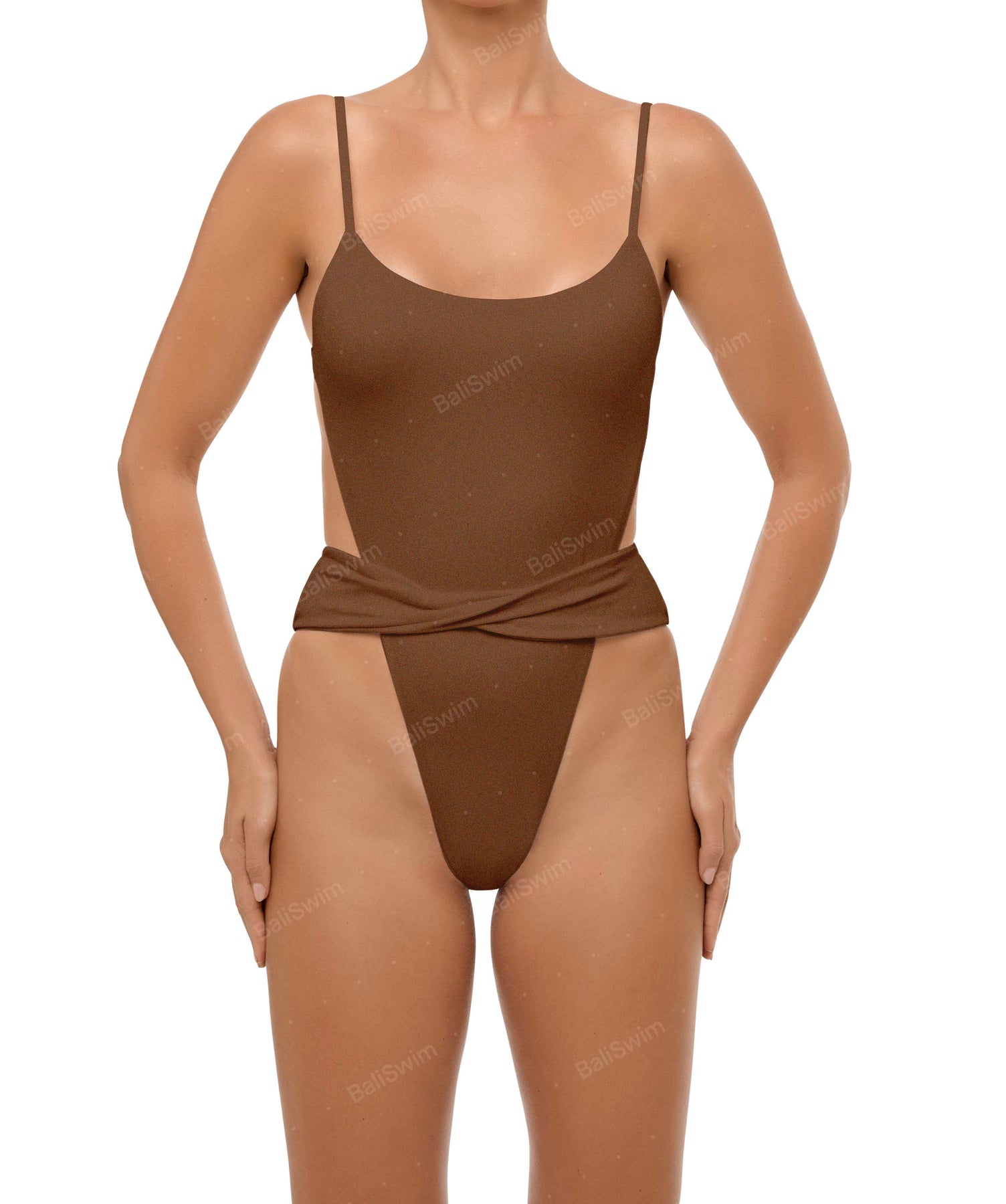 - Detail Feature: Tank one-piece with a wraparound style, twisted front belt, adjustable shoulder straps, and a clasp closure