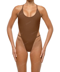 - Detail Feature: Racerback bikini one-piece with a low back and high-cut leg