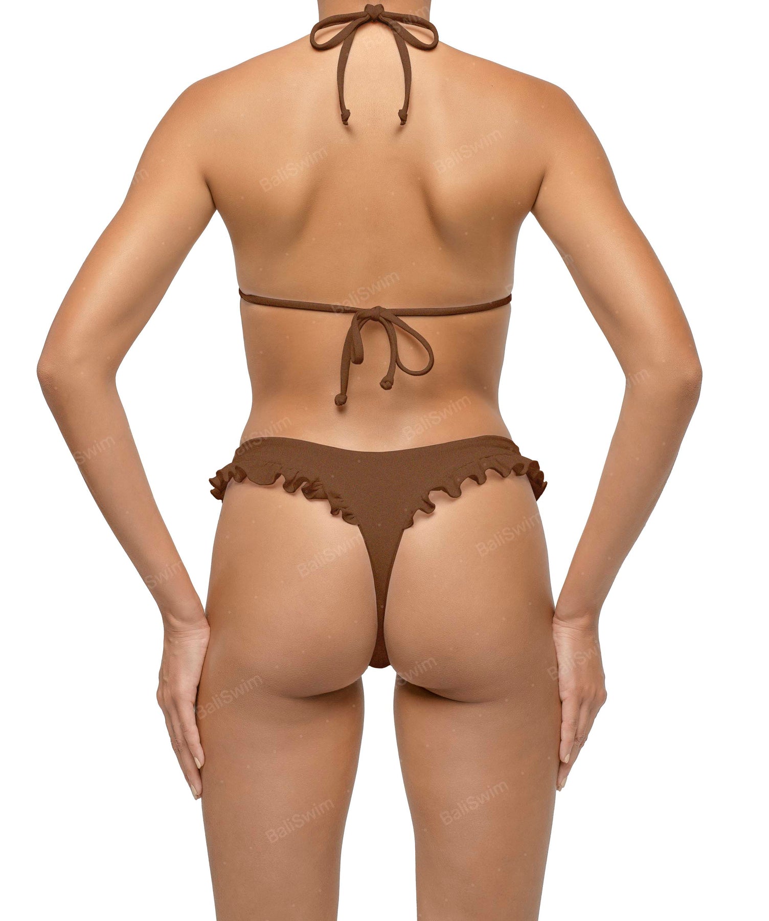 - Detail Feature: Tringle bikini top, Ruffle bust detail, Adjustable halter ties, Adjustable tie closure