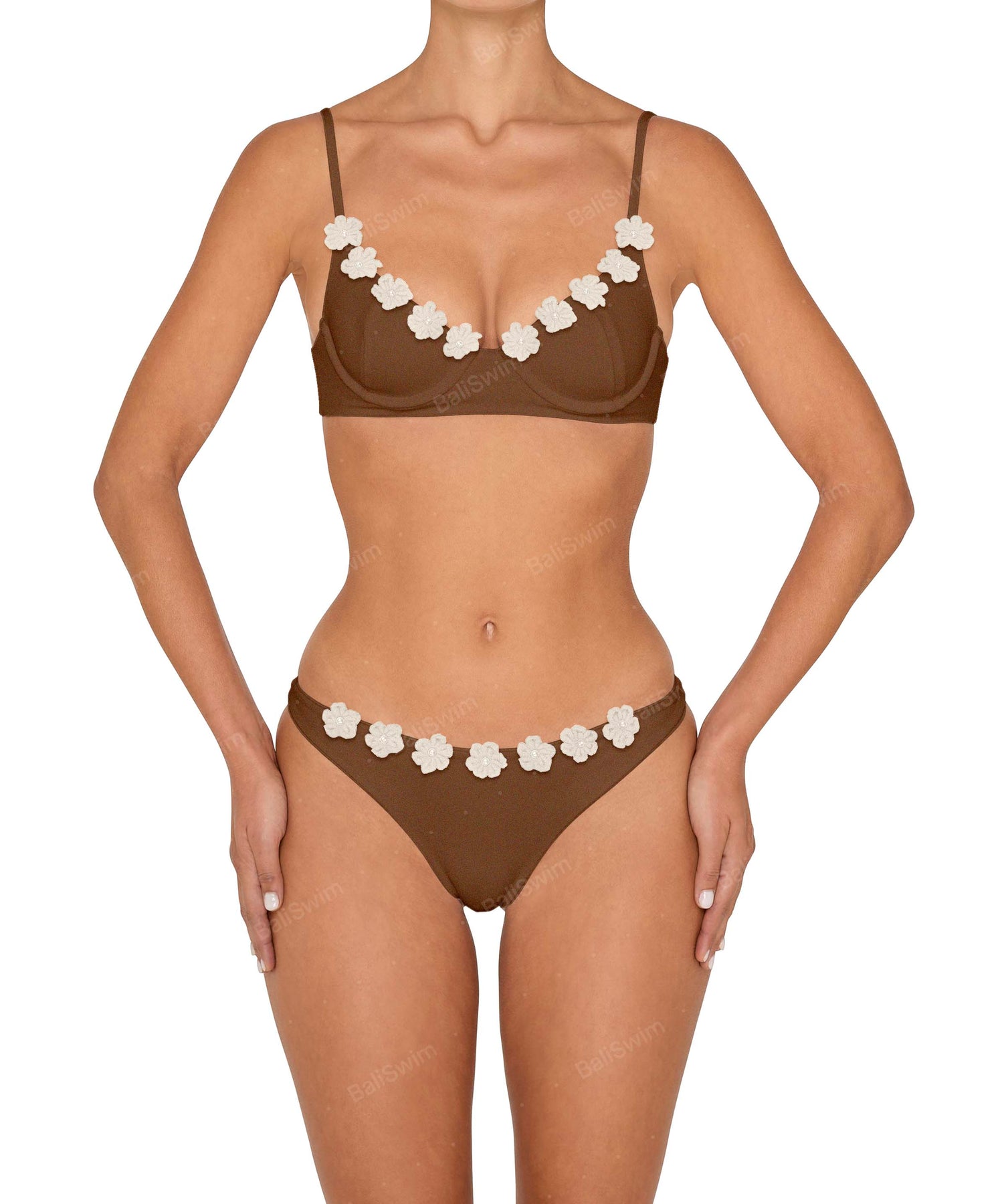 - Detail Feature: Underwire self tied top, Flower crochet along neckline, Adjustable shoulder straps