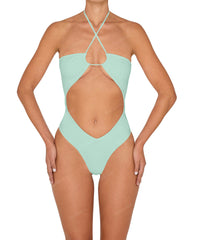 - Style: Halter Tie Neck One Piece With Center Front Cutout