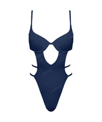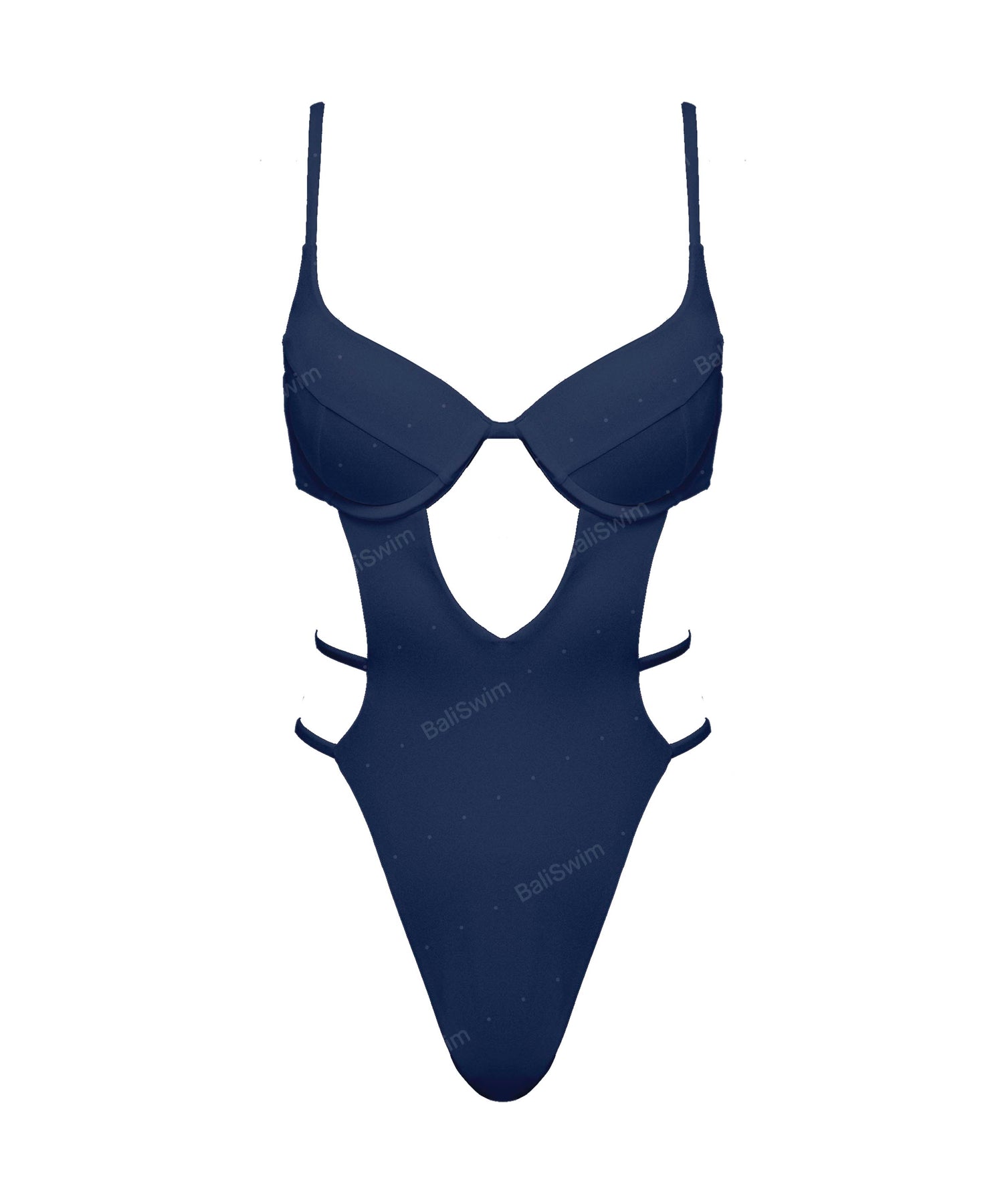 - Detail Feature: Underwire one-piece with cut-out and waist strap detail, adjustable shoulder straps, and a high-cut leg