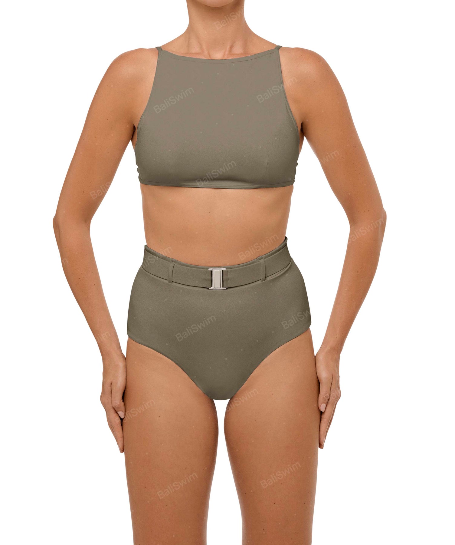 - Detail Feature: High rise bikini bottom, Detachable belt, Belt loops on waistband