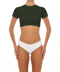 • Detail Feature: Cropped raglan rash guard with short sleeves in a pull-on style