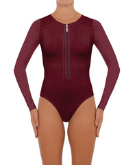 - Detail Feature: Long-sleeve rash guard one-piece with princess line paneling and a front zipper opening