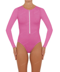 - Detail Feature: Long-sleeve rash guard one-piece with princess line paneling and a front zipper opening