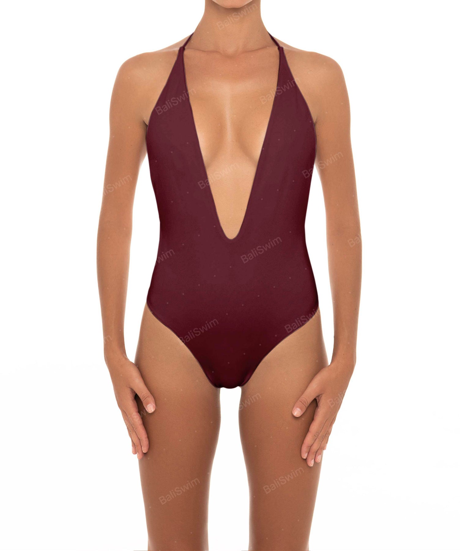 - Detail Feature: Plunge V-neck one-piece with adjustable halter ties and an open back