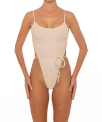 - Detail Feature: Tank one-piece with a wraparound style, adjustable straps, tie and clasp closures, and adjustable bum coverage
