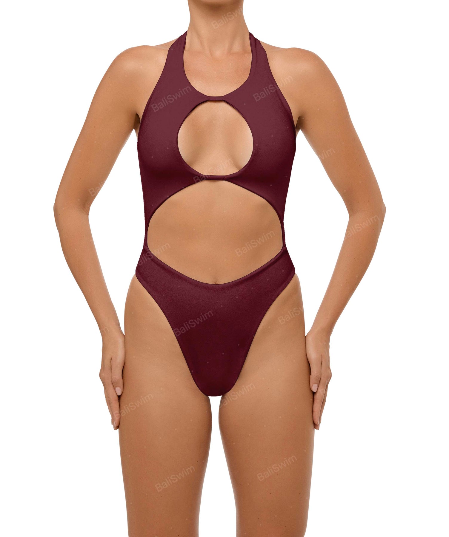 - Detail Feature: High-neck keyhole one-piece with cut-out details and a high-cut leg