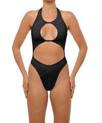 - Detail Feature: High-neck keyhole one-piece with cut-out details and a high-cut leg