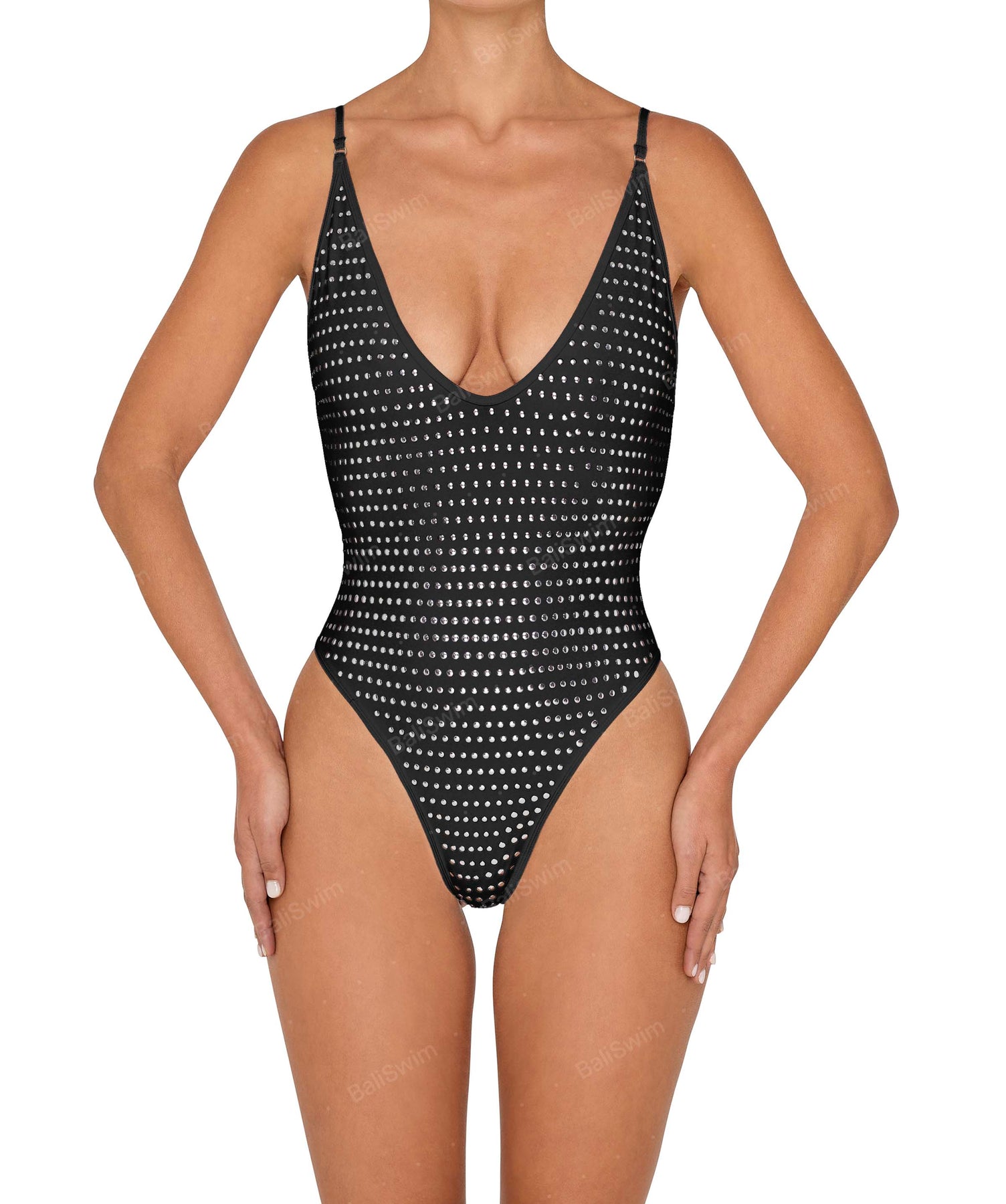 - Style: Studded Binded Plunge Neck One Piece