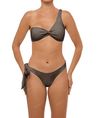 - Detail Feature: Asymmetric bikini top, Fixed shoulder strap, Front loop detail, Clasp closure