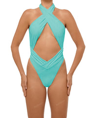 - Detail Feature: Halter cut out one piece, Adjustable halter ties, Criss cross neck, Ruched waist and side seam, Low V-waist, High cut, Low back