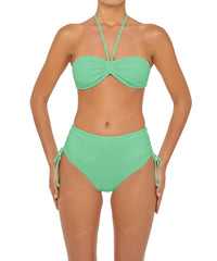 - Detail Feature: High rise bikini bottom, Adjustable leg opening option, Side ruched drawstrings detail, Hidden elastic band