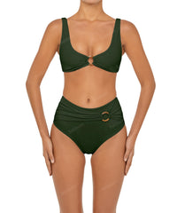 - Detail Feature: High rise bikini bottom, Waist overlay with O-Ring, Ruched detail