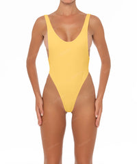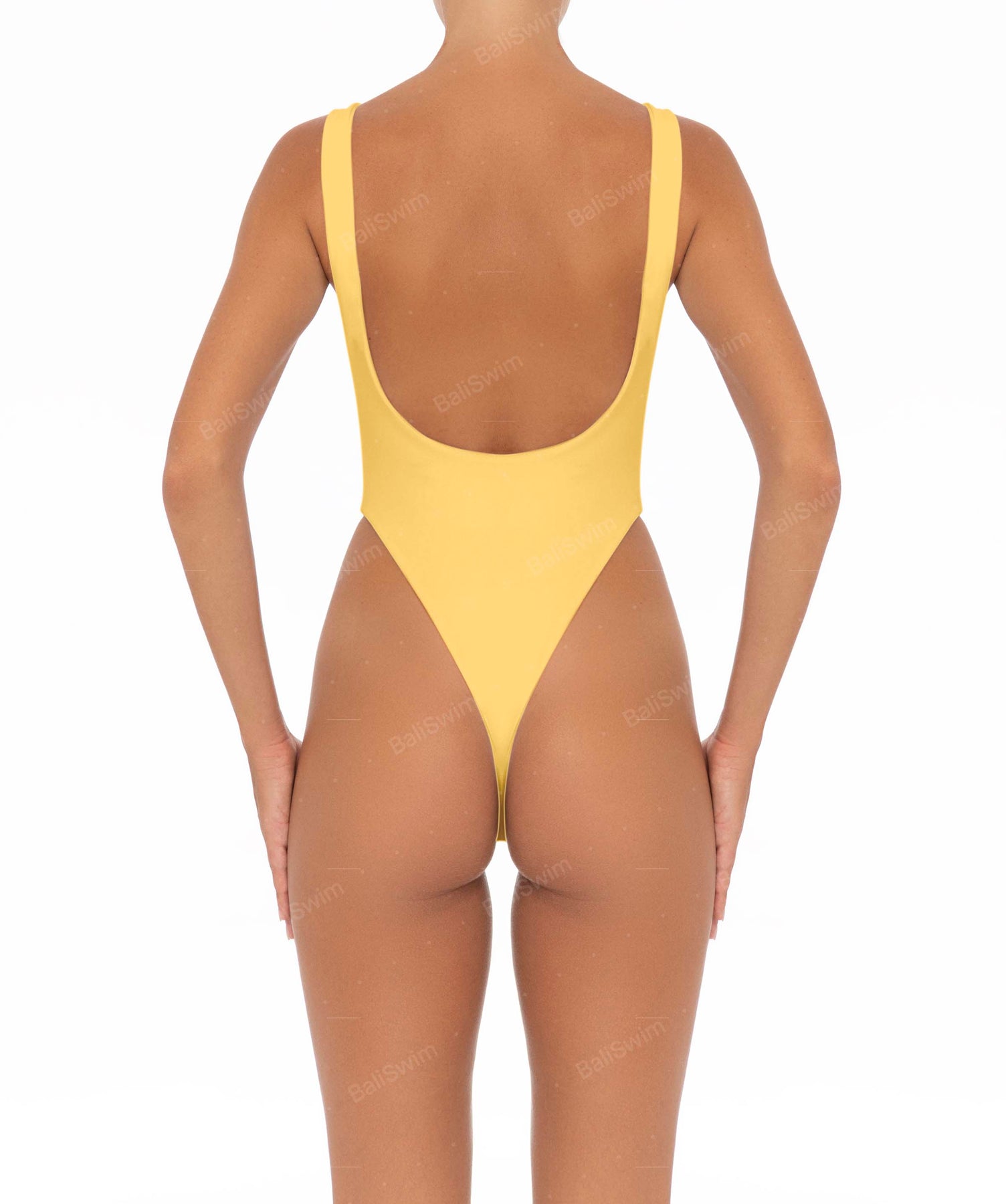 - Detail Feature: Scoop neck one-piece with drop armholes, a low back, and a high-cut leg