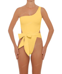 • Detail Feature: Asymmetrical one-piece with a one-shoulder design, wraparound style, and adjustable tie closure