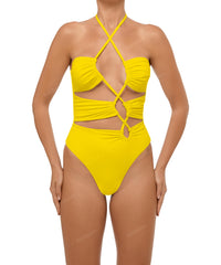 - Detail Feature: Asymmetric cut out one piece, Ruching detail, Adjustable criss cross halter neck