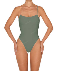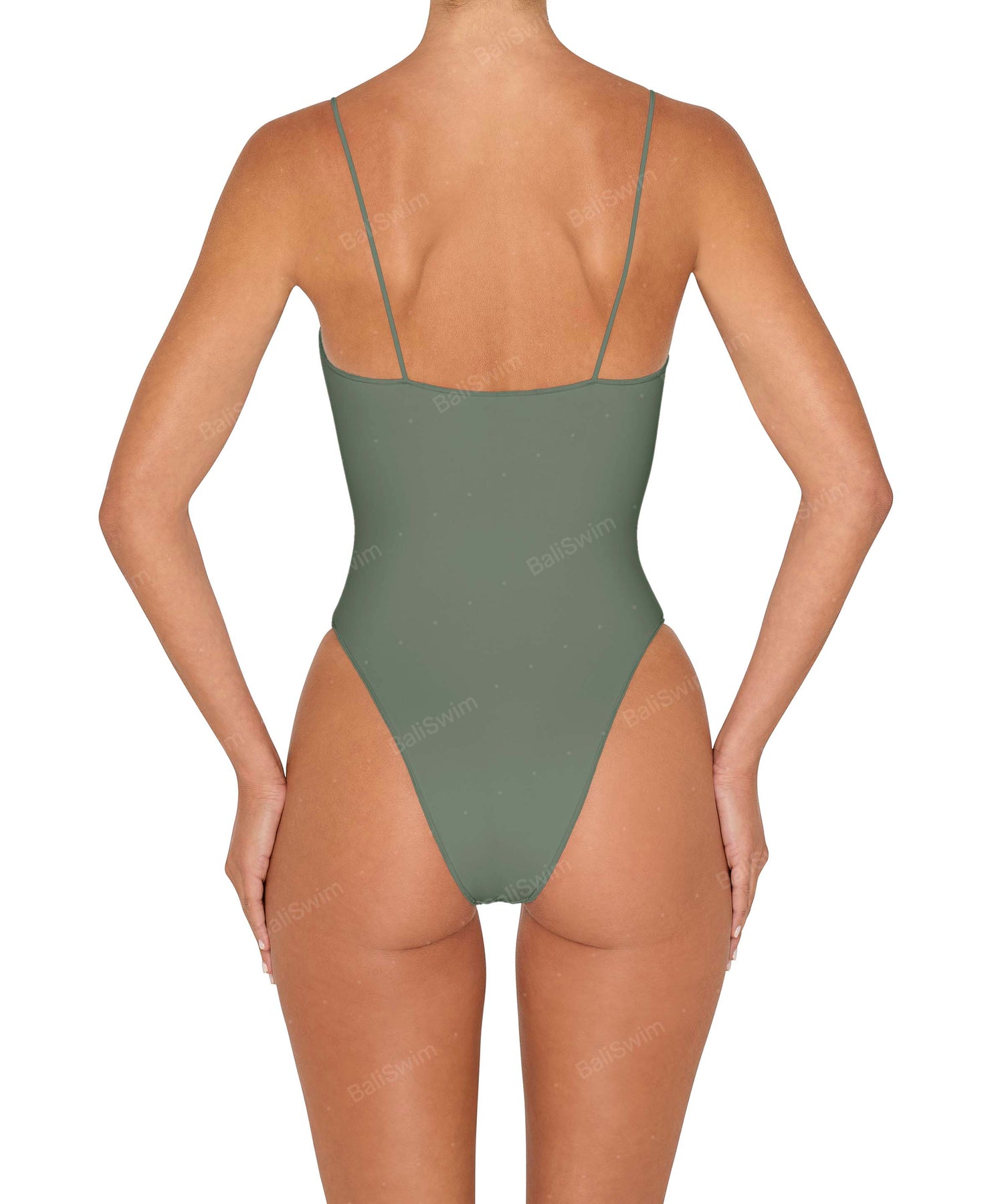 - Detail Feature: Square neckline one piece, with high leg opening, elastic corded straps, and baby lock stitch finishing