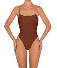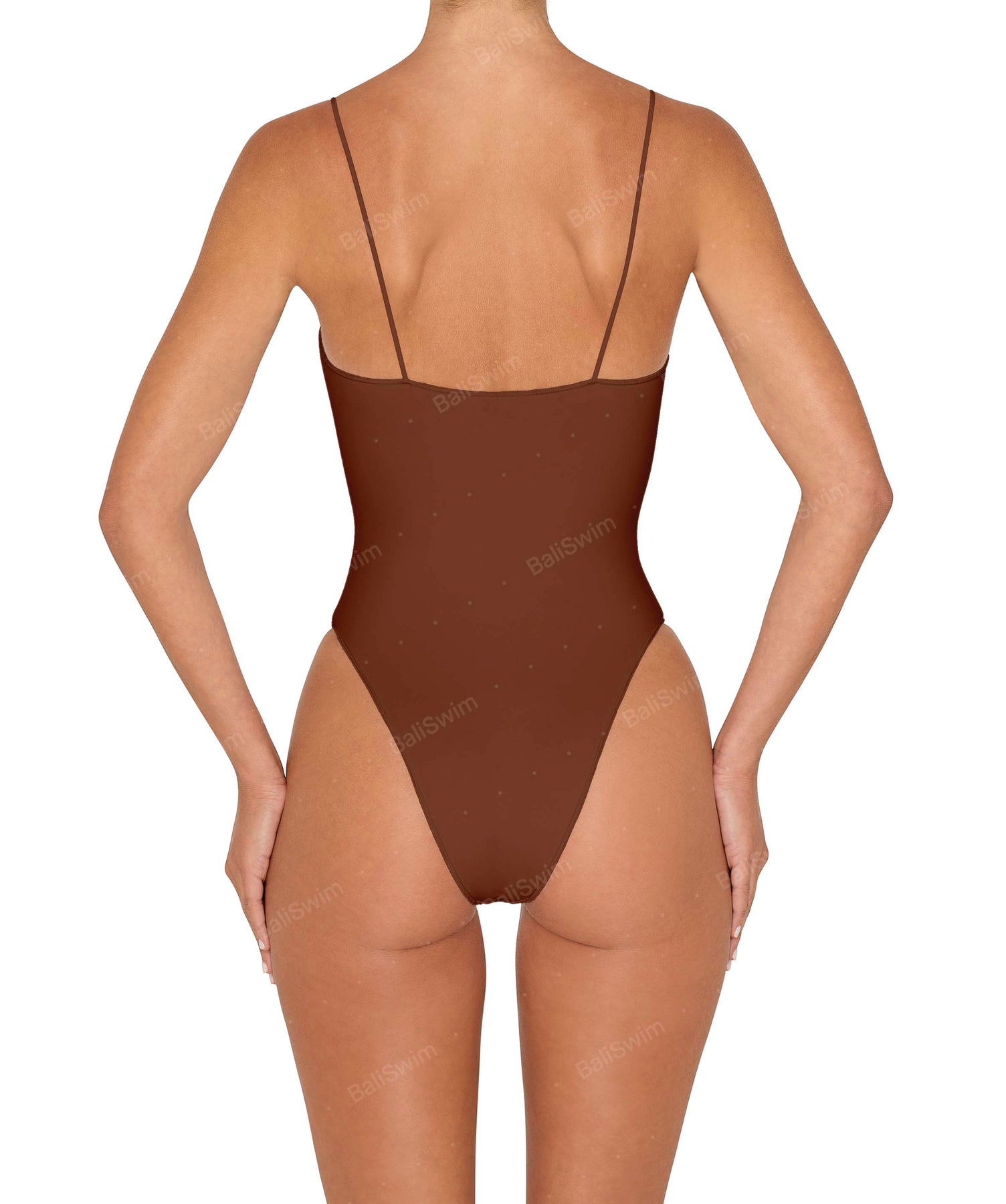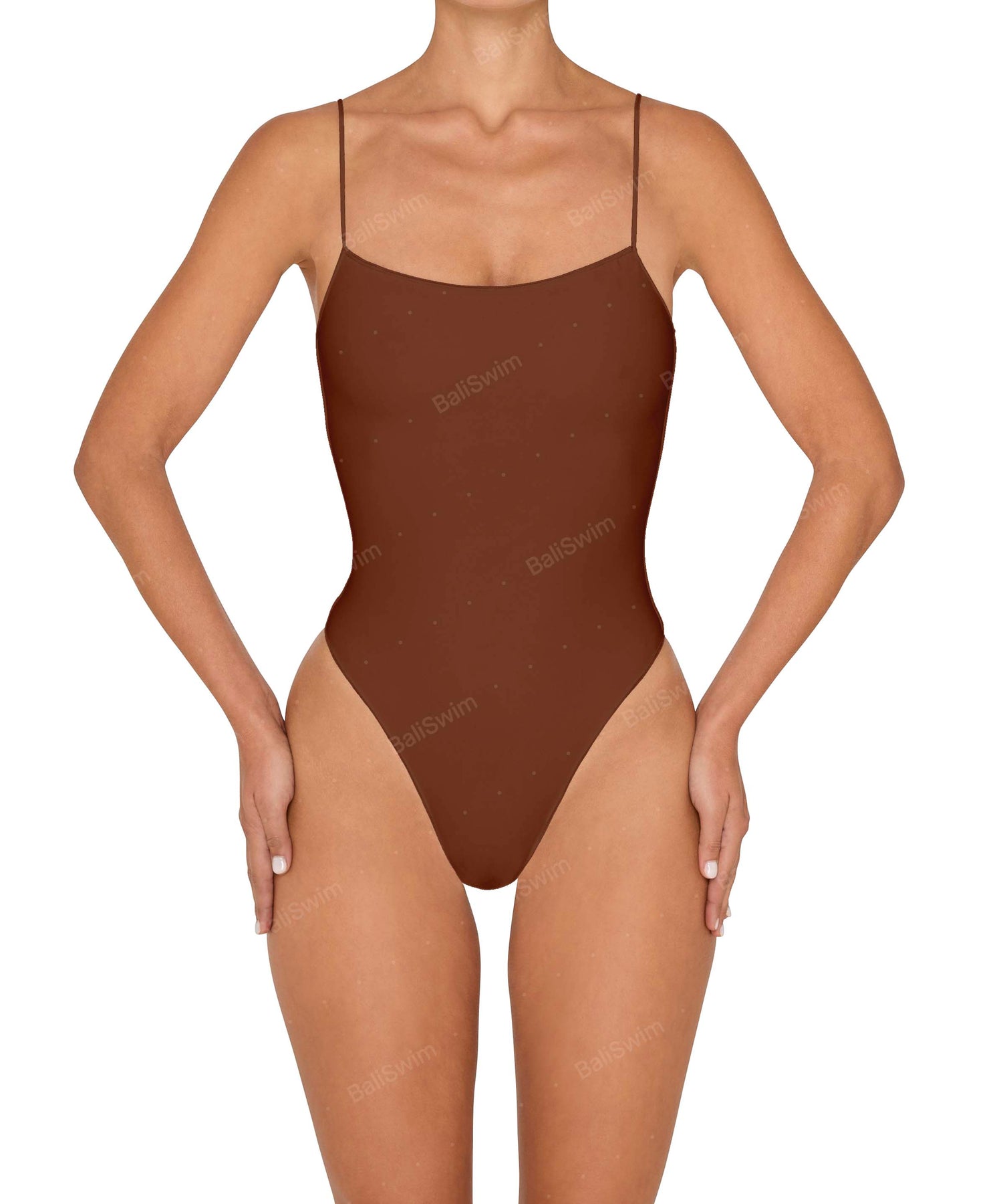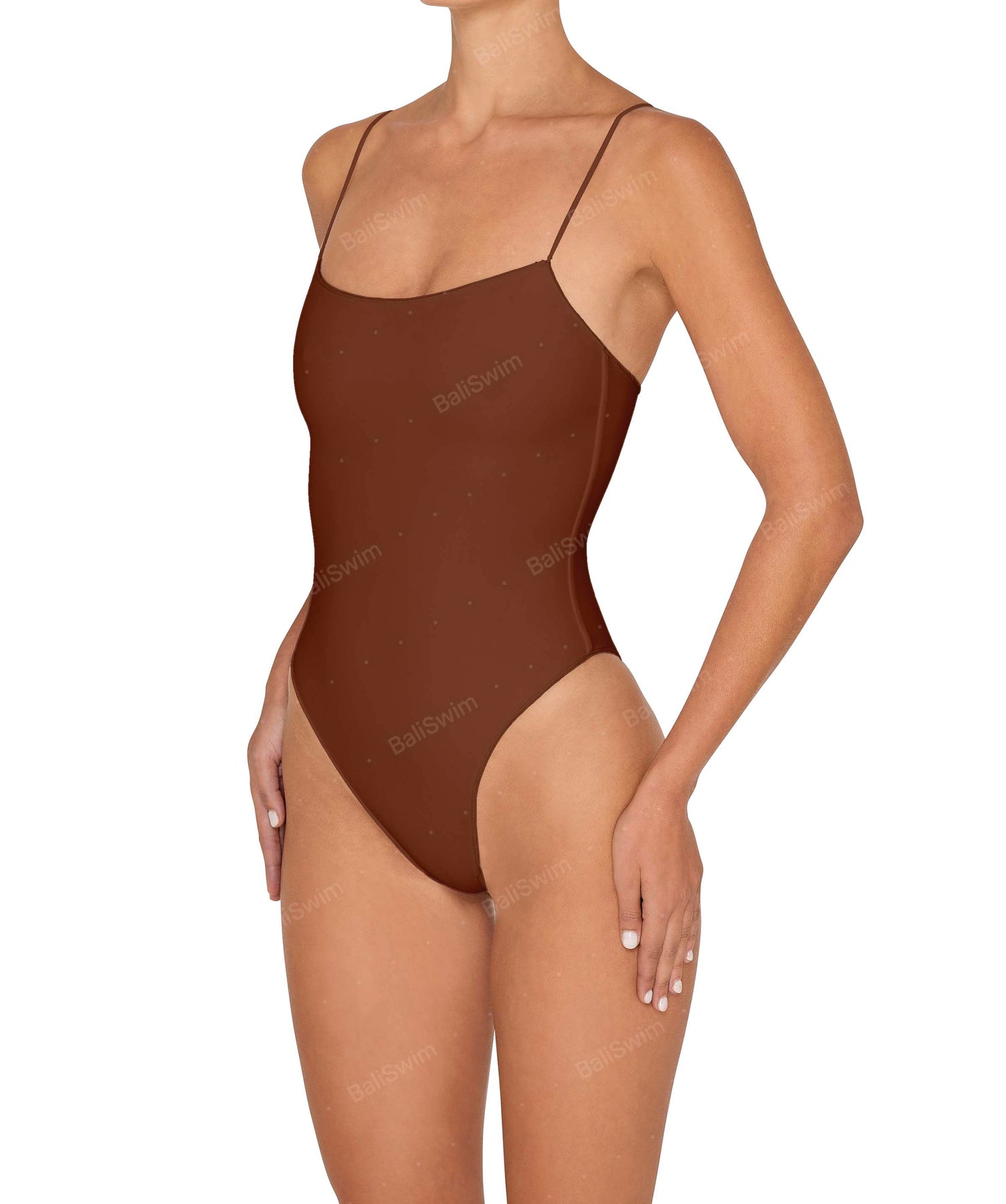 - Detail Feature: Square neckline one piece, with high leg opening, elastic corded straps, and baby lock stitch finishing