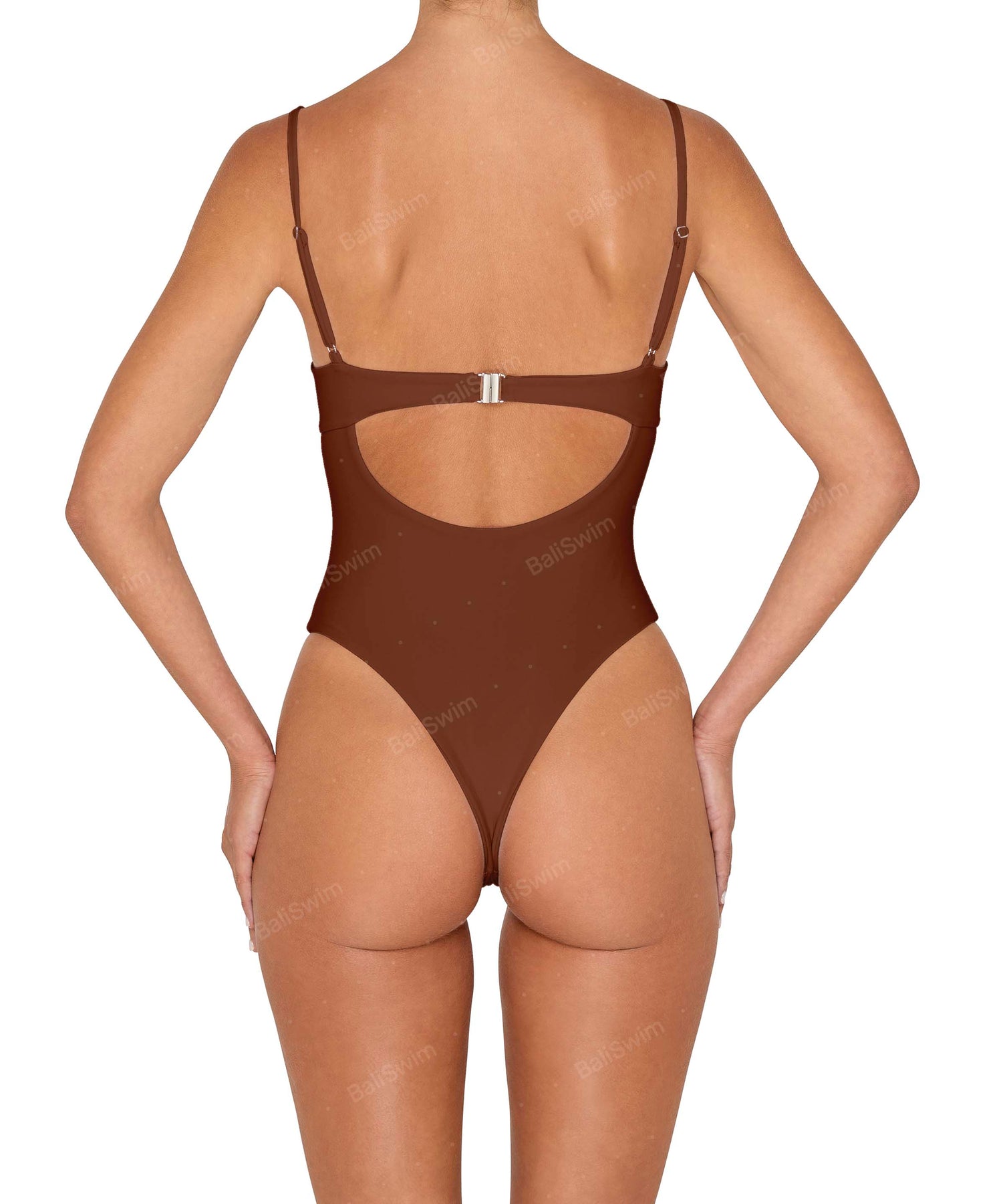 - Detail Feature: Classic underwire one piece with adjustable straps, high leg opening, back cut-out and back clasp