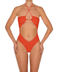 - Style: Halter Tie Neck One Piece With Center Front Cutout