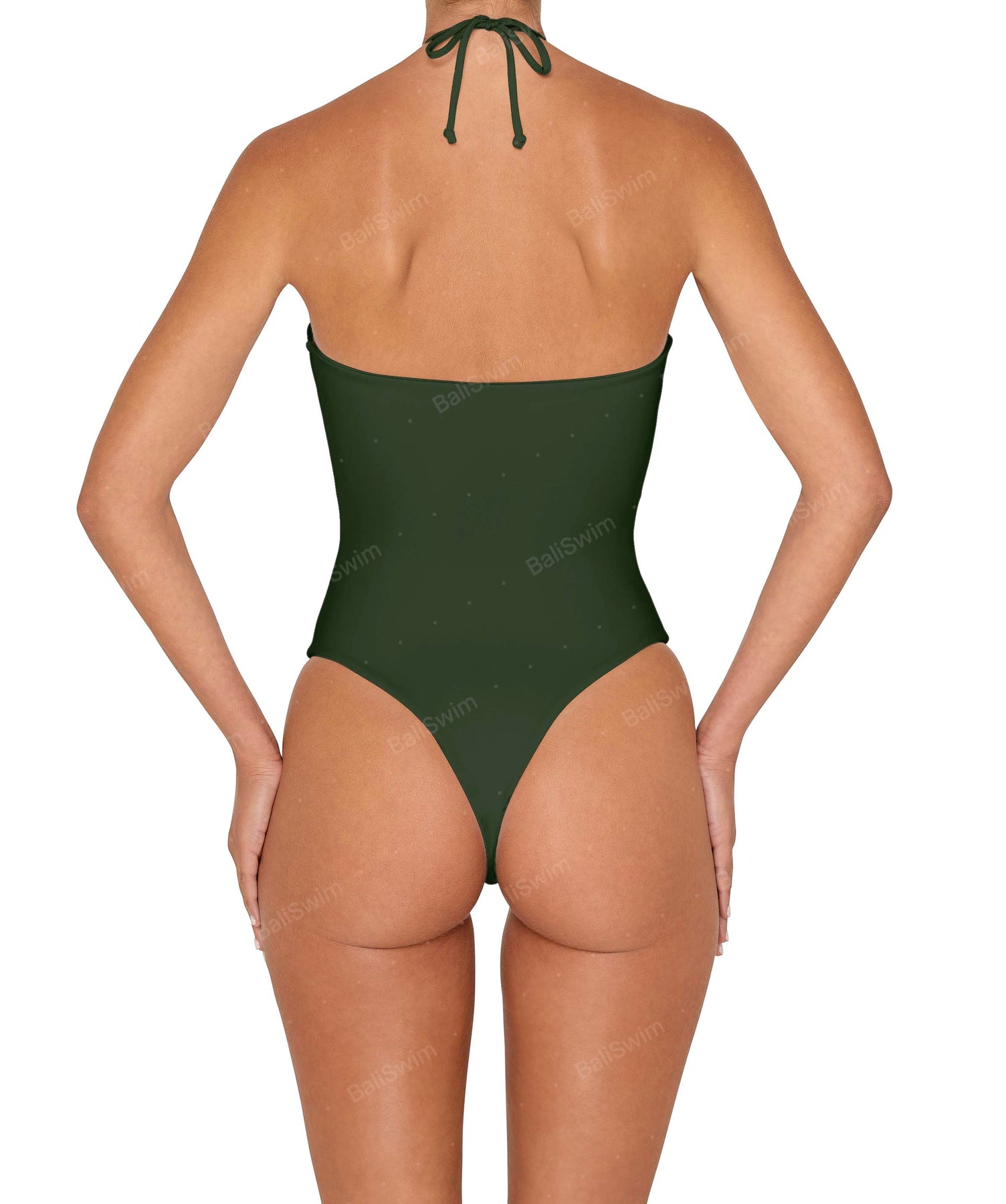 - Detail Feature: Halter tie neck one piece with center front cutout and V shape bottom, high cut leg opening, spaghetti straps. Multi-style as halter or bandeau