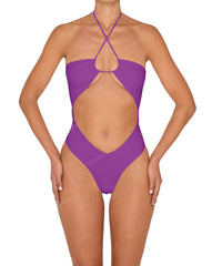 - Detail Feature: Halter tie neck one piece with center front cutout and V shape bottom, high cut leg opening, spaghetti straps. Multi-style as halter or bandeau