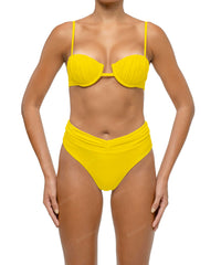 - Detail Feature: Front and back ruching detail, High rise, High cut, Brief style
