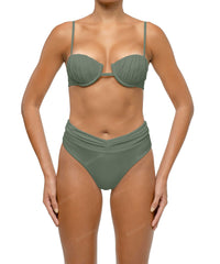 - Detail Feature: Front and back ruching detail, High rise, High cut, Brief style