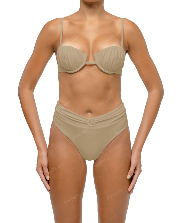 - Detail Feature: Front and back ruching detail, High rise, High cut, Brief style
