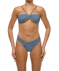 - Detail Feature: Halter bandeau bikini top, Front loop bandeau, Draped detail, Adjustable shoulder straps, Adjustable tie closure