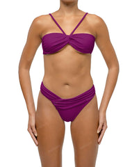 - Detail Feature: Halter bandeau bikini top, Front loop bandeau, Draped detail, Adjustable shoulder straps, Adjustable tie closure