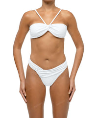 - Detail Feature: Halter bandeau bikini top, Front loop bandeau, Draped detail, Adjustable shoulder straps, Adjustable tie closure