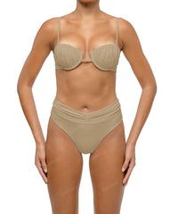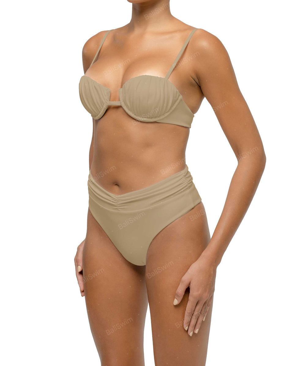 - Detail Feature: Balconette bikini top, Bust gathered detail, Fixed padding with underwire, Adjustable Straps, Clasp closure