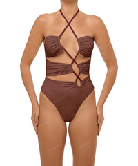- Detail Feature: Asymmetric cut out one piece, Ruching detail, Adjustable criss cross halter neck