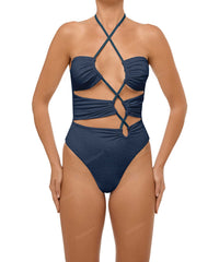 - Detail Feature: Asymmetric cut out one piece, Ruching detail, Adjustable criss cross halter neck