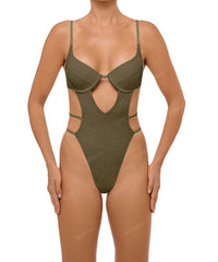 - Detail Feature: V-underwired one piece, Cut out detail, Waist strap detail, Adjustable shoulder straps, High cut